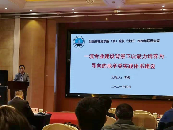 会上,我院李强副院长代表学院作“一流专业背景下以创新能力培养为导向的地学类实践体系建设”报告。李院长介绍我院通过构建“基础、专业、创新”三层次实践教学平台,依托“双能型”师资队伍,围绕“兴趣、基础、思维、综合、创新”五要素实践教学思路,取得了地学类人才创新能力培养的良好成效。
