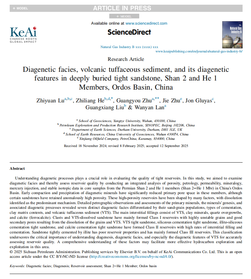 鄂尔多斯盆地是中国重要的致密气产区,上古生界山2段与盒1段是该区最主要的致密砂岩气储层。尽管早期压实和成岩矿物的沉淀显著降低了原生孔隙,部分砂岩仍保留了异常高孔隙度。为深入评价储层质量,来自伟德国际victor1946深层与非常规团队、中国石化石油勘探开发研究院及杜伦大学等机构的联合研究团队,围绕山2-盒1段致密砂岩的成岩相类型、火山凝灰质沉积(VTS)及其成岩特征展开系统研究,在Natural Gas Industry B(主编:邹才能院士,张金川教授,中科院工程技术大类2区、能源与燃料小类2区)发表Diagenetic Facies, Volcanic Tuffaceous Sediment, and Its Diagenetic Features in Deeply Buried Tight Sandstone, Shan 2 and He 1 Members, Ordos Basin, China(鄂尔多斯盆地山2段-盒1段深埋致密砂岩成岩相、火山凝灰质沉积物及其成岩特征),旨在揭示其对储层物性的控制机制,为该区致密气高效勘探与开发提供理论依据。