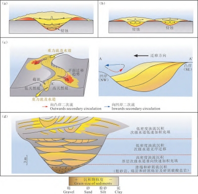 研究结果表明:不同类型重力流水道的形成受控于重力流的流体类型与能量的变化,复合水道沉积受重力流类型及其能量变化的控制,早期以碎屑流为主,能量最高,形成水道的轴部;中期发育高密度浊流,能量较高,厚层次级水道沉积垂向加积充填;晚期发育低密度浊流,能量较低,次级水道沉积单元侧向迁移;末期发育低密度浊流,能量最低,以加积为主,水道沉积摆动幅度小。迁移水道沉积受较高能量的低密度浊流的二次环流控制,在水道弯曲处通过不对称堤岸的发育促进低密度浊流向凹岸侵蚀,形成侧积体。垂向加积水道沉积受较低能量的低密度浊流影响,水道内部限制性层状充填。分支水道沉积受低能量浊流影响,以非限制性加积作用为主,次级水道单元无序摆动且规模较小(图1)。