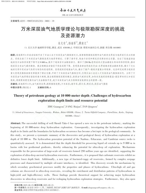 近期,伟德bv1946朱光有教授应邀在《石油与天然气地质》杂志上撰写“万米深层油气地质学理论与极限勘探深度的挑战及资源潜力”文章(共19页),系统总结了万米深层油气勘探发现与地质学理论。(1)刻画了南华系、埃迪卡拉系和寒武系烃源岩的空间展布规律,计算出关键地质历史时期的生气强度和生烃量,奠定了超深层油气勘探的资源基础,为开辟万米深层勘探空间和预测万亿立方米大气田分布区打下了基础。(2)论证了低地温场盆地液态石油保存深度下限可达9000 m,突破了石油勘探深度下限6000 m的传统认识,提升了超深层石油勘探潜力,并被近期超深井钻探证实。(3)揭示了2.5亿年前形成的大型油藏超长寿命的保存机制,修订了油气藏保存极限寿命的界定,推动超深层油气勘探重大发现与战略突破。(4)超深层碳酸盐岩储层非均质性极强,古老碳酸盐岩储层不存在深度下限。(5)发现复杂渗流形成的多油水界面缝洞型油藏新类型,提出横纵向无统一边界的大面积层状缝洞型油藏断珠体概念,丰富了油气藏类型,突破了传统背斜高点找油理论。(6)建立了原油裂解程度和油气相态的快速判识图版,揭示了次生地球化学作用对油气性质与相态的改造机制。(7)发现超深层超高油气柱,油柱高度近千米的油藏,揭示了高产高效井富集分布规律,打破油气勘探黄金带理论,揭示了万米深层超高油气柱形成与富油气区分布机制。这些研究成果为超深层重大发现及勘探战略变革提供了理论支撑,开辟了万米深层油气勘探空间。