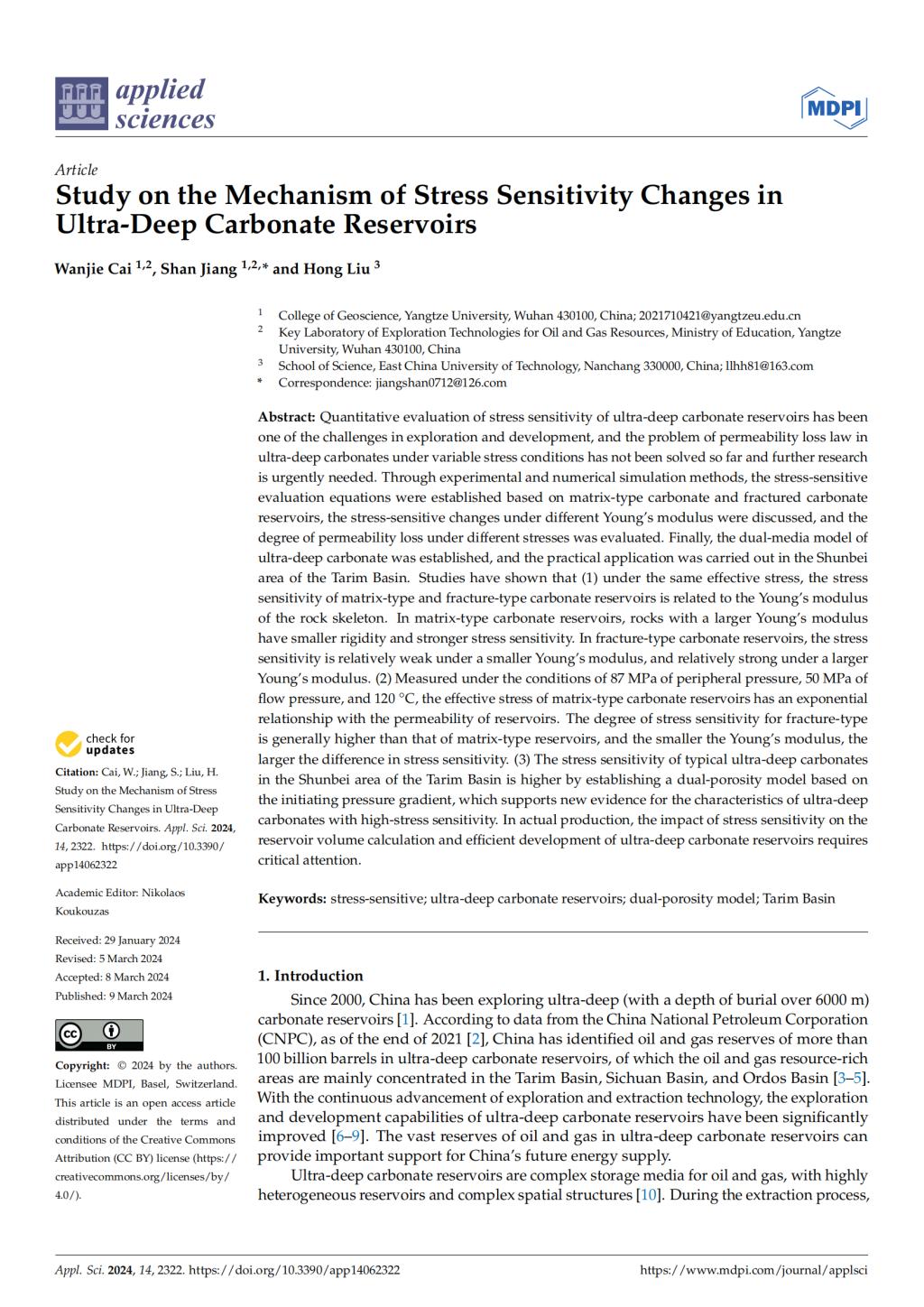 地科学院硕士生蔡万杰在《Applied sciences》发表题为“Study on the Mechanism of Stress Sensitivity Changes inUltra-Deep Carbonate Reservoirs”的研究论文。伟德bv1946为论文第一署名单位,硕士生蔡万杰为论文第一作者,教师江山为通讯作者。