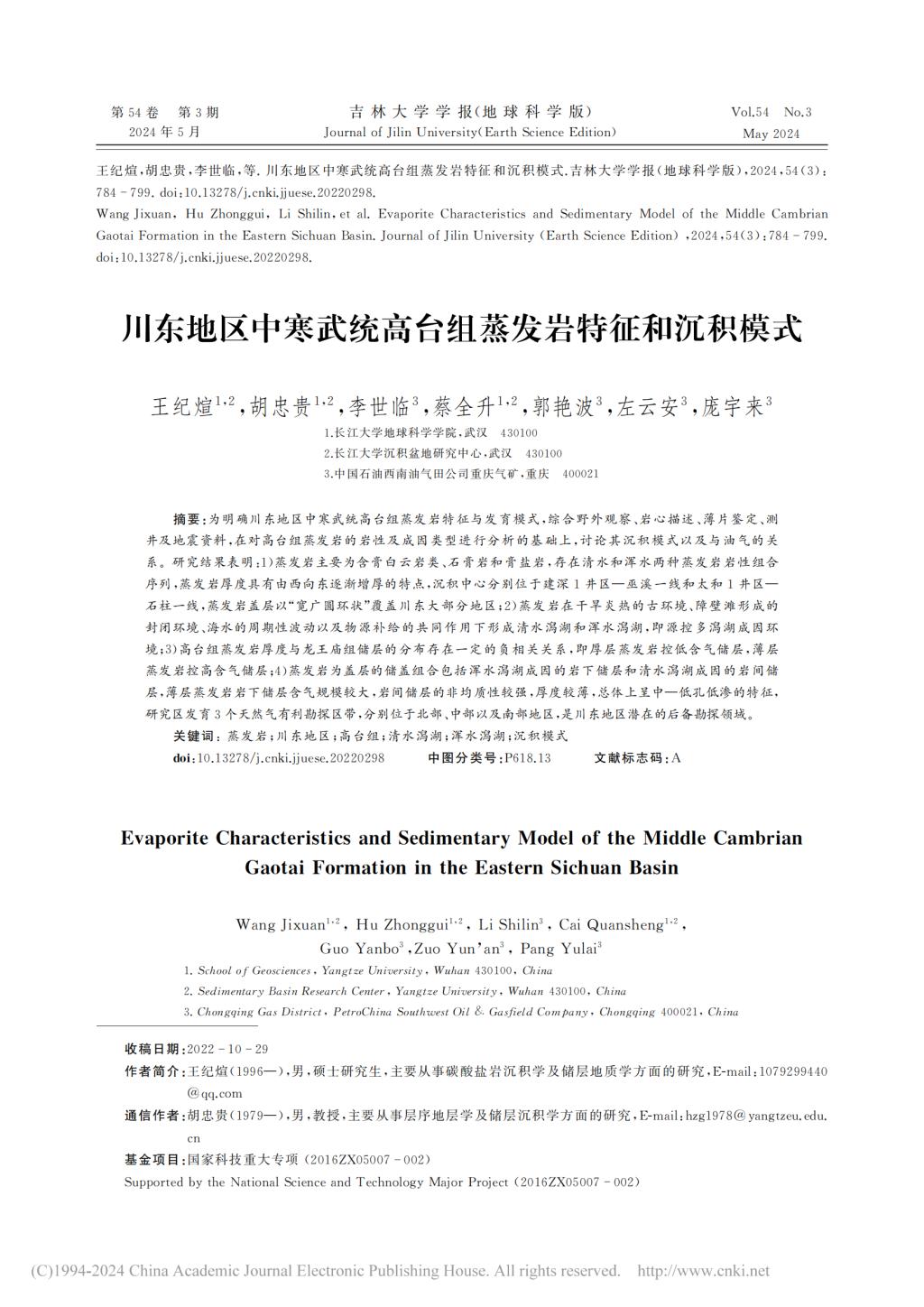 伟德bv194620级硕士研究生王纪煊在期刊《吉林大学学报(地球科学版)》上发表题为“川东地区中寒武统高台组蒸发岩特征和沉积模式”的研究论文。伟德bv1946为论文第一署名单位,硕士研究生王纪煊为论文第一作者,其导师胡忠贵教授为该文通讯作者。