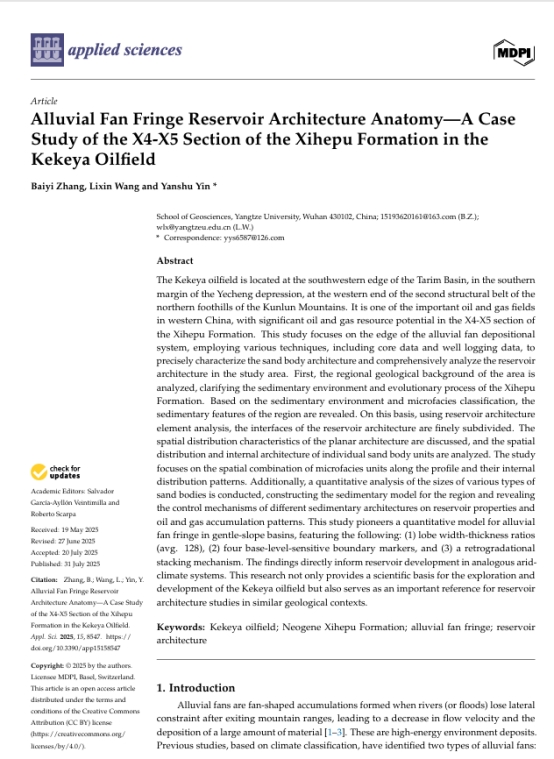 伟德bv1946硕士生张佰义在SCI收录期刊《Applied Sciences》上发表题为“Alluvial Fan Fringe Reservoir Architecture Anatomy — A Case Study of the X4-X5 Section of the Xihepu Formation in the Kekeya Oilfield”的研究论文。伟德bv1946为论文第一署名单位,张佰义为论文第一作者,尹艳树教授为通讯作者。