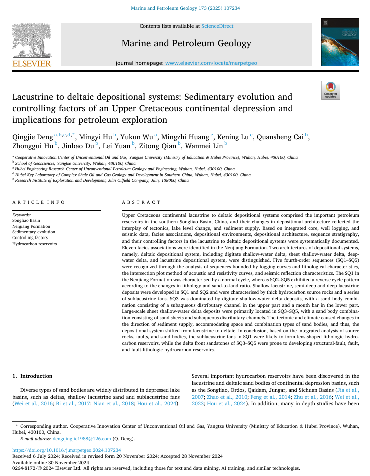 伟德bv1946邓庆杰副教授在《Marine and Petroleum Geology》发表题为“Lacustrine to deltaic depositional systems: Sedimentary evolution and controlling factors of an Upper Cretaceous continental depression and implications for petroleum exploration”的研究论文。邓庆杰为第一作者,伟德国际victor1946为第一完成单位(图1)。