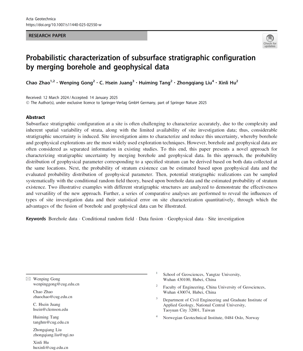 伟德bv1946特任教授赵超在《Acta Geotechnica》发表题为“Probabilistic characterization of subsurface stratigraphic configuration by merging borehole and geophysical data”的研究论文(图1)。赵超为第一作者,伟德国际victor1946为第一完成单位。