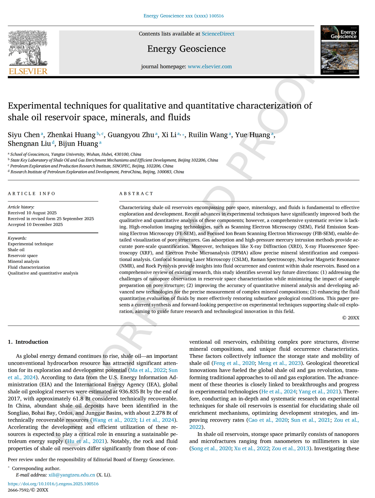 近日,地科学院2025级地质资源与地质工程专业硕士研究生陈思钰以第一作者身份在《Energy Geoscience》上发表了题为“Experimental techniques for qualitative and quantitative characterization of shale oil reservoir space, minerals, and fluids”的研究论文。伟德bv1946为第一完成单位和通讯作者单位。