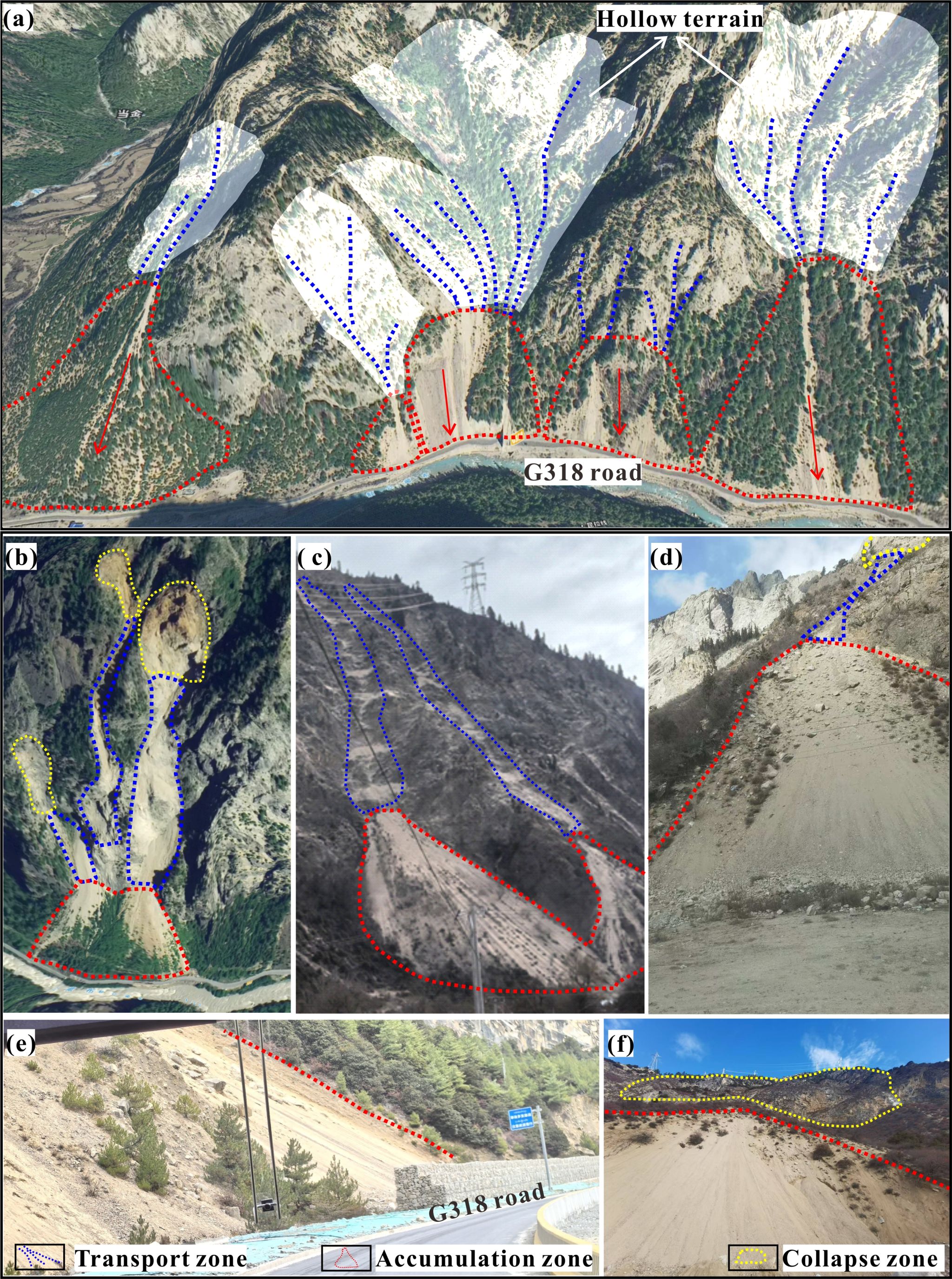 在全球范围的高山地区,如欧洲阿尔卑斯山脉、加拿大落基山脉等,倒石锥斜坡分布广泛。其中,在藏东南G318国道波密至然乌段沿线,溜沙-倒石锥边坡对路基、车辆及行人构成威胁。这些溜沙-倒石锥边坡呈现出显著的地貌特征(图2),其后缘与基岩露头相接。通常,坡体上部存在陡崖或洼地地形,并常伴有一条或多条侵蚀沟,这些缺乏植被覆盖的沟谷在遥感影像中呈现为黄色条带。粗沙质沉积物通过沟谷向下运移,并在坡脚处堆积。