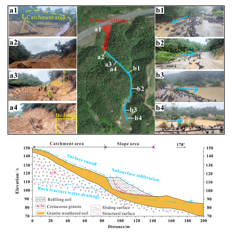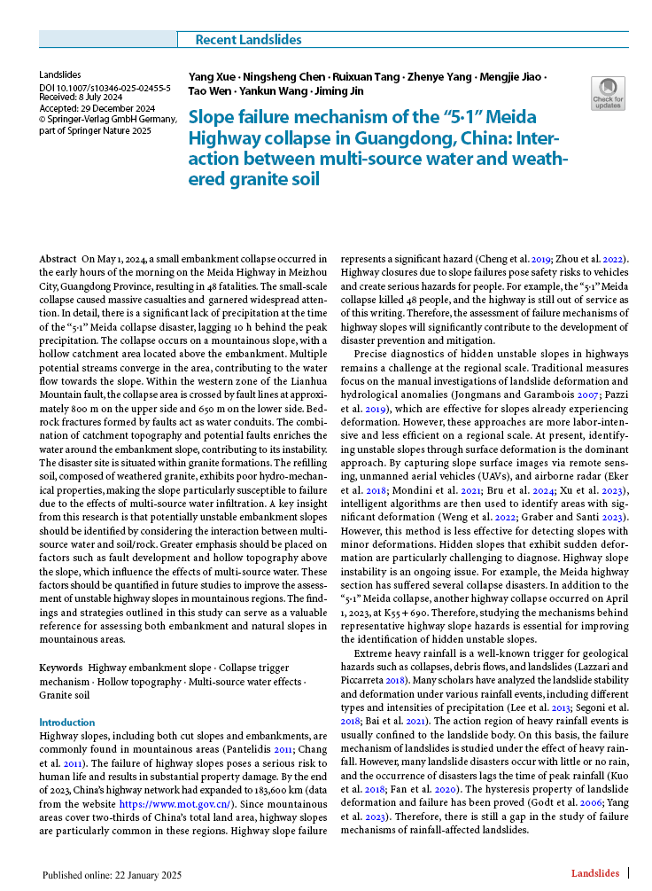 伟德bv1946地质系、工程地质研究中心团队成员薛阳副教授在老牌期刊《Landslides》(实时影响因子7.0,位列JCR分区一区,中科院大类二区)上发表题为“Slope Failure Mechanism of the "5·1" Meida Highway Collapse in Guangdong, China: Interaction Between Multi-Source Water and Weathered Granite Soil”的论文(图1),薛阳副教授为第一作者,陈宁生教授为通讯作者,伟德国际victor1946为第一完成单位。