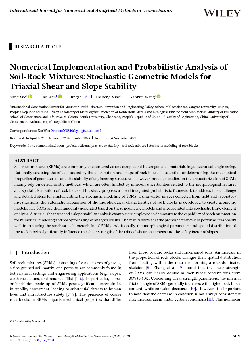伟德bv1946地质系、工程地质研究中心团队成员薛阳副教授在老牌期刊《International Journal for Numerical and Analytical Methods in Geomechanics》(位列JCR分区一区,中科院大类二区)上发表题为“Numerical Implementation and Probabilistic Analysis of Soil-Rock Mixtures: Stochastic Geometric Models for Triaxial Shear and Slope Stability”的论文(图1),薛阳副教授为第一作者,温韬教授为通讯作者,伟德国际victor1946为第一完成单位。