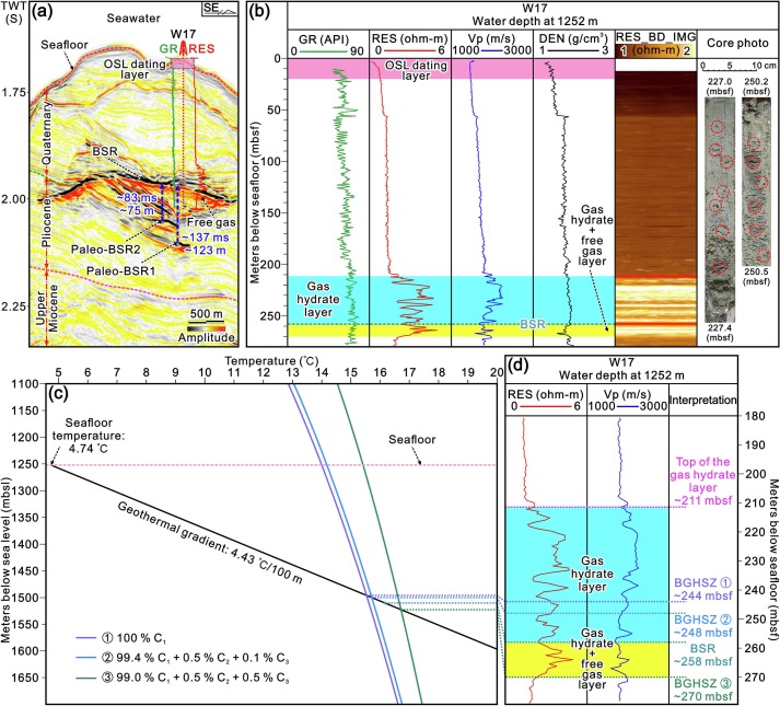 该研究聚焦南海北部神狐海域天然气水合物分解主控因素问题。通过对W17井开展岩芯-测井-地震综合研究,利用光释光测年建立了约12.4万年以来高精度年代框架,结合古水深重建与热传导模拟,揭示了末次冰期以来海平面变化而非底水温度变化是控制深海天然气水合物分解的主导因素。研究指出,冰期海平面显著下降导致天然气水合物稳定带底界上移,触发水合物分解、甲烷释放,可能加剧全球变暖并加速间冰期到来(图2和图3)。