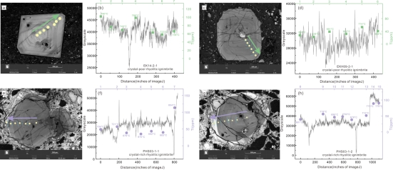 图3 贫晶体与富晶体火山岩的代表性CL图像及其Ti含量-灰度剖面