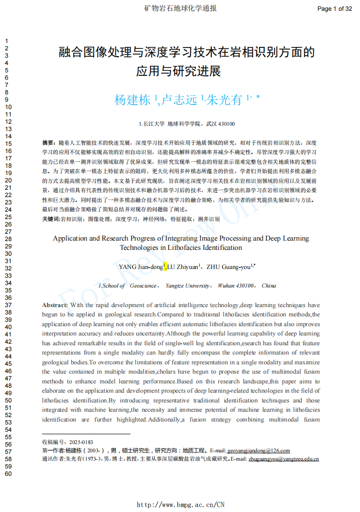 地科学院2025级地质工程专业硕士生杨建栋以第一作者身份在中文核心期刊《矿物岩石地球化学通报》上发表题为《融合图像处理与深度学习技术在岩相识别方面的应用与研究进展》的论文。伟德bv1946为论文第一署名单位,硕士生杨建栋为论文第一作者,其导师朱光有教授担任论文通讯作者。