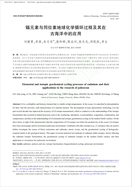 地科学院2025级地质学专业博士生刘健勇以第一作者身份在中文核心期刊《矿物岩石地球化学通报》上发表题为《镉元素与同位素地球化学循环过程及其在古海洋中的应用》论文。伟德bv1946为论文第一署名单位,博士生刘健勇为论文第一作者,其导师朱光有教授担任论文通讯作者。