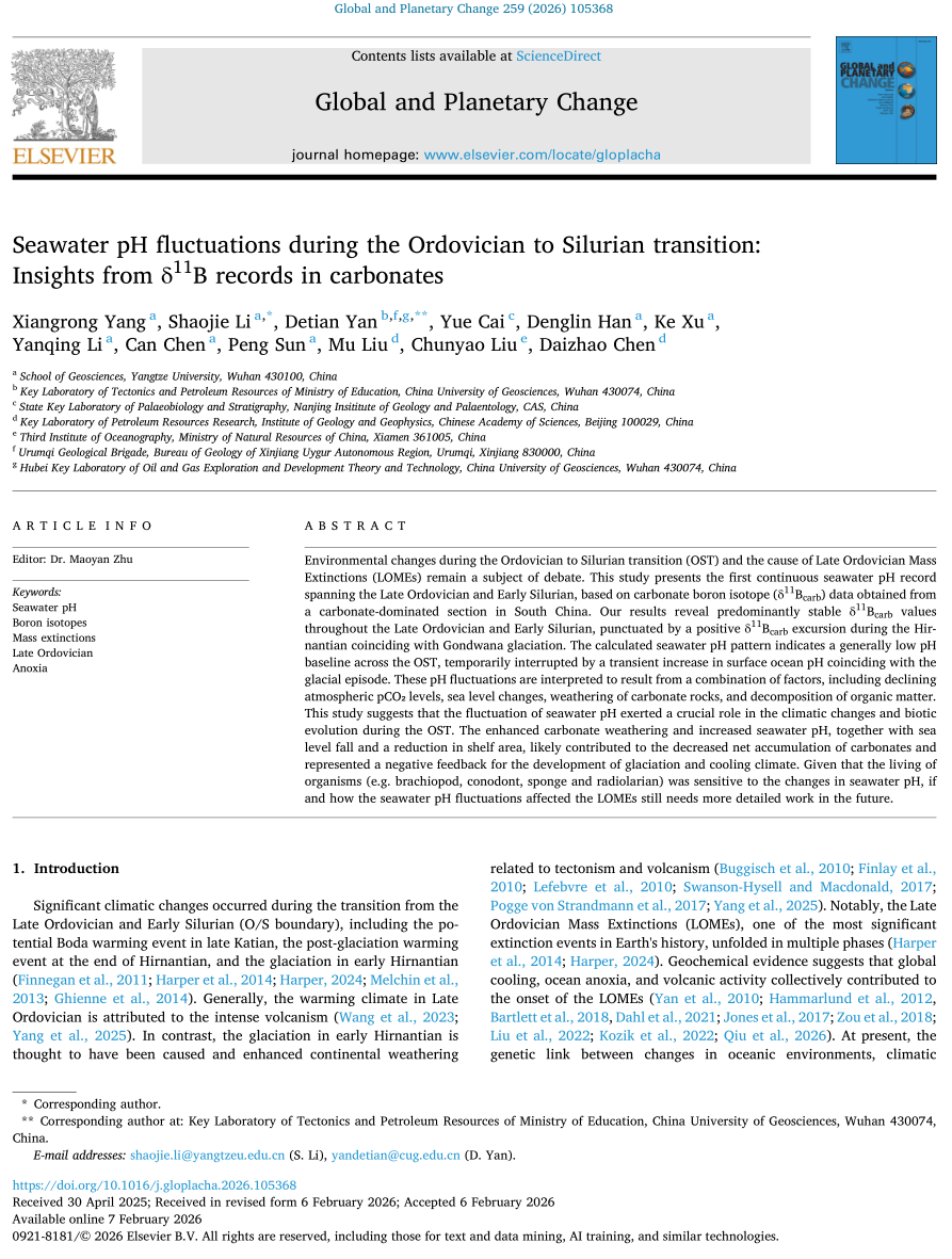 我校伟德bv1946杨向荣副教授在中科院一区期刊《Global and Planetary Change》发表题为“Seawater pH fluctuations during the Ordovician to Silurian transition:Insights from δ11B records in carbonates”的研究论文,伟德bv1946李劭杰特任教授为第一通讯作者,第一署名单位为伟德国际victor1946(图1)。论文介绍了奥陶纪-志留纪这一重要地质历史转折期内的古气候条件转变过程,及其影响下的表层海水酸碱度(pH)值变化和生物演化过程。