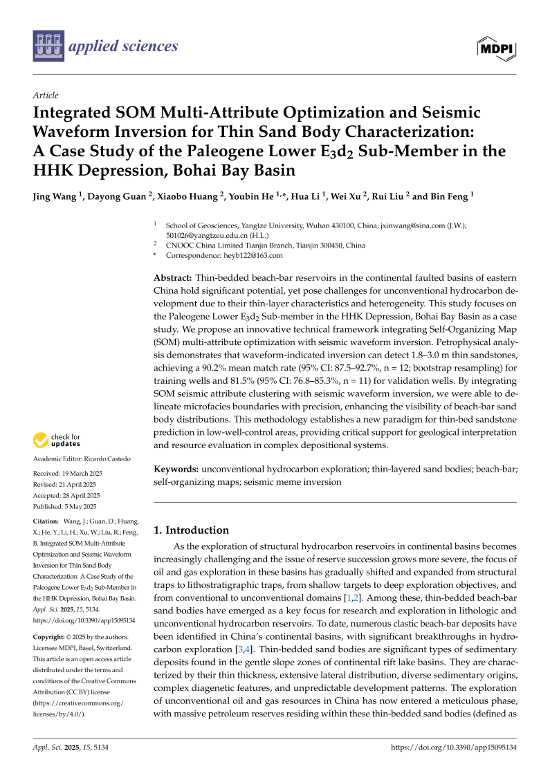 伟德bv1946博士生王晶在《Applied Sciences》上发表题为“Integrated SOM Multi-Attribute Optimization and Seismic Waveform Inversion for Thin Sand Body Characterization: A Case Study of the Paleogene Lower E3d2 Sub-Member in the HHK Depression, Bohai Bay Basin”的研究论文。伟德bv1946为论文第一署名单位,博士生王晶为论文第一作者,其导师何幼斌为通讯作者。