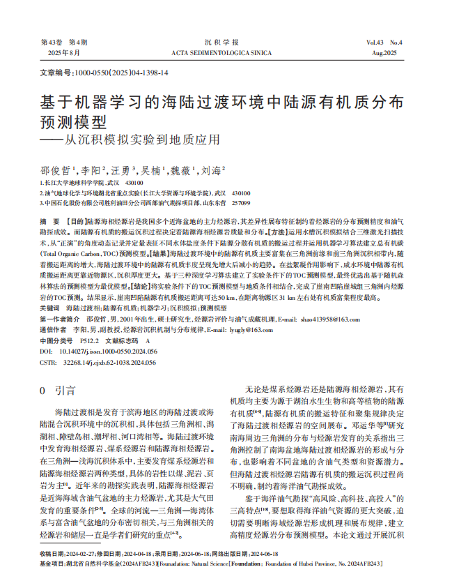近日,地科学院2023级地质学专业硕士生邵俊哲以第一作者身份在中文核心期刊《沉积学报》上发表题为“基于机器学习的海陆过渡环境中陆源有机质分布预测模型”的研究论文。硕士生邵俊哲为论文第一作者,伟德bv1946为第一完成单位。
