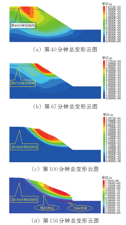 图3 试验边坡不同时刻模拟总变形云图
