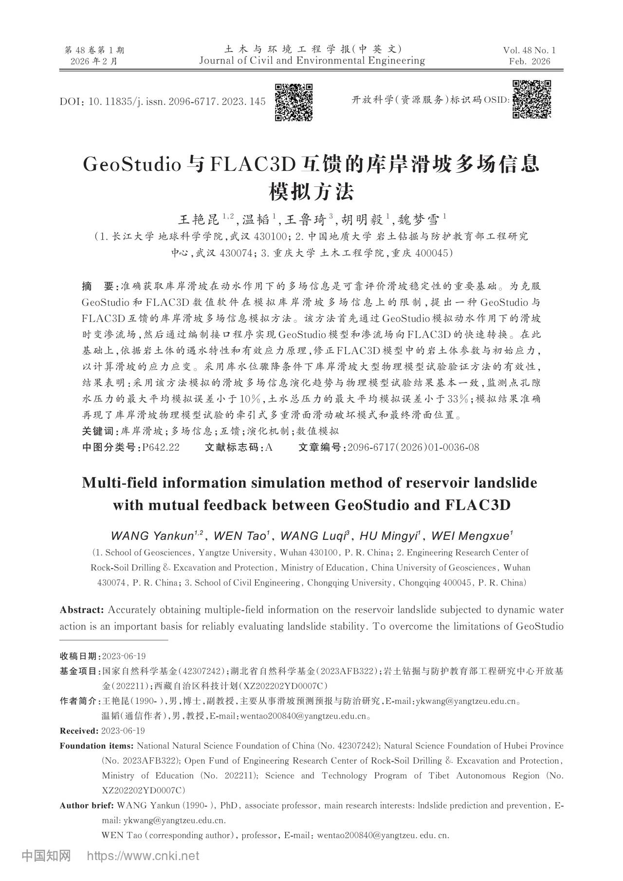 我校伟德bv1946王艳昆副教授在北大中文核心期刊《土木与环境工程学报(中英文)》发表题为“GeoStudio与FLAC3D互馈的库岸滑坡多场信息模拟方法”的研究论文,伟德bv1946温韬教授为第一通讯作者,伟德bv1946为第一署名单位(图1)。