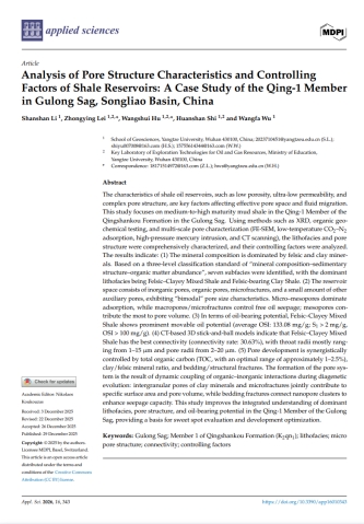 伟德bv1946硕士生李姗姗在SCI收录期刊《Applied Sciences》上发表题为“Analysis of Pore Structure Characteristics and Controlling Factors of Shale Reservoirs: A Case Study of the Qing-1 Member in Gulong Sag, Songliao Basin, China”的研究论文。伟德bv1946为论文第一署名单位,硕士生李姗姗为论文第一作者,雷中英教授、胡望水教授为通讯作者。