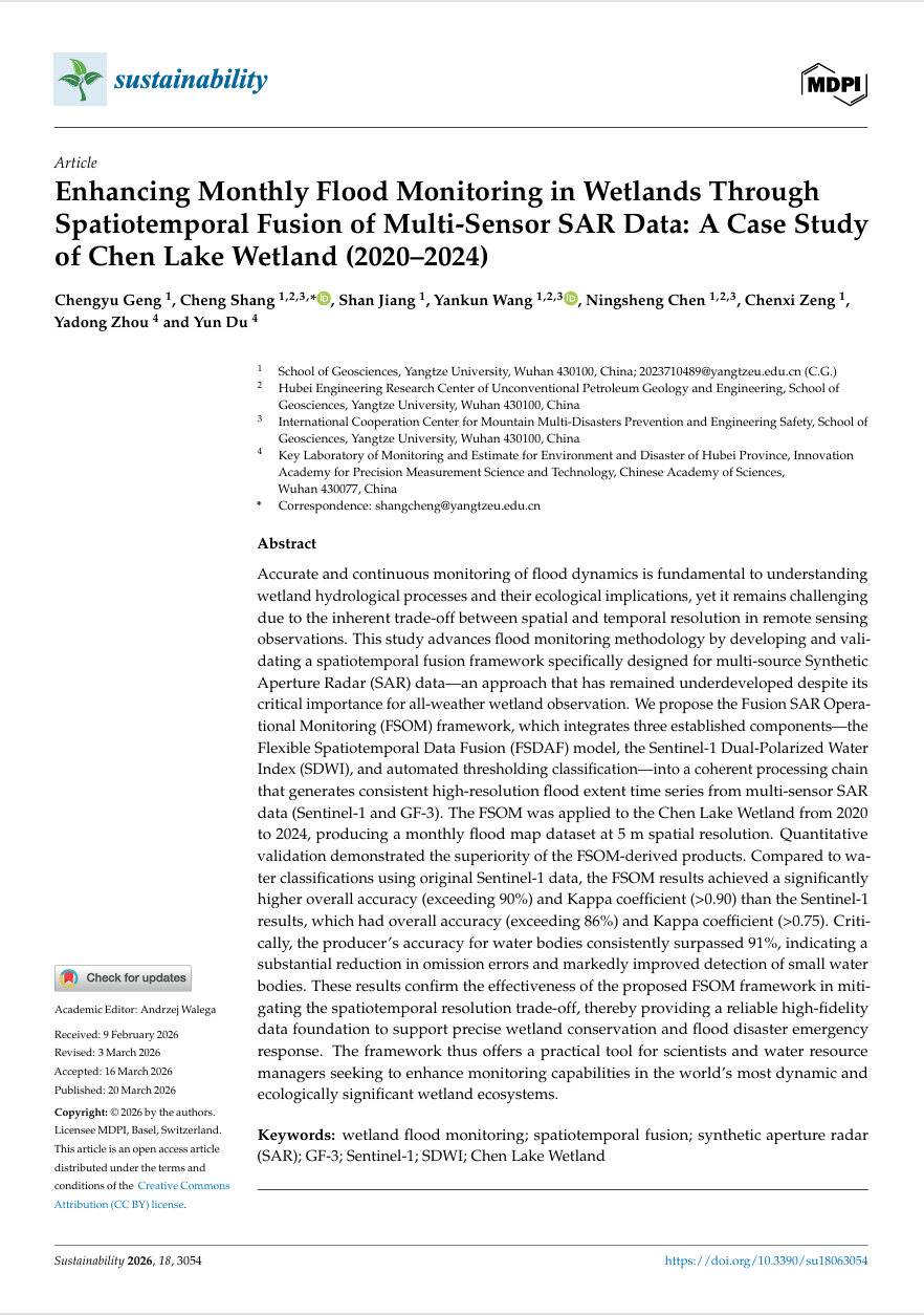 伟德bv1946硕士研究生耿澄羽在资源与环境类SCI期刊《Sustainability》上发表题为“Enhancing Monthly Flood Monitoring in Wetlands Through Spatiotemporal Fusion of Multi-Sensor SAR Data: A Case Study of Chen Lake Wetland (2020–2024)”的研究论文。伟德bv1946/山地多灾害防控与工程安全国际科技合作基地为论文第一署名单位,研究生耿澄羽为论文第一作者,尚成老师为通讯作者,论文是在尚成/陈宁生老师的指导下完成的。