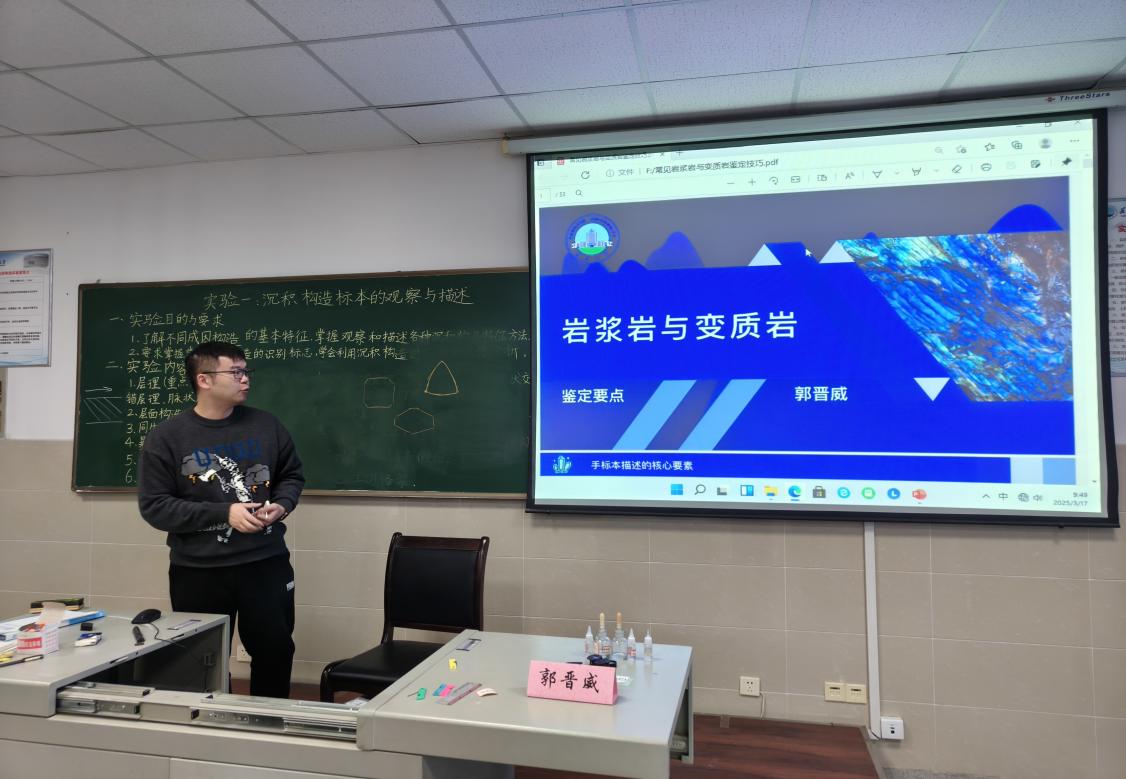 郭晋威老师以《岩浆岩和变质岩的鉴定要点》为例,讲述手标本描述的核心要素,带领同学们观察不同矿物颜色、速率和颗粒大小,归纳岩石的特征,生动讲解了常见岩浆岩与变质岩的鉴定技巧。