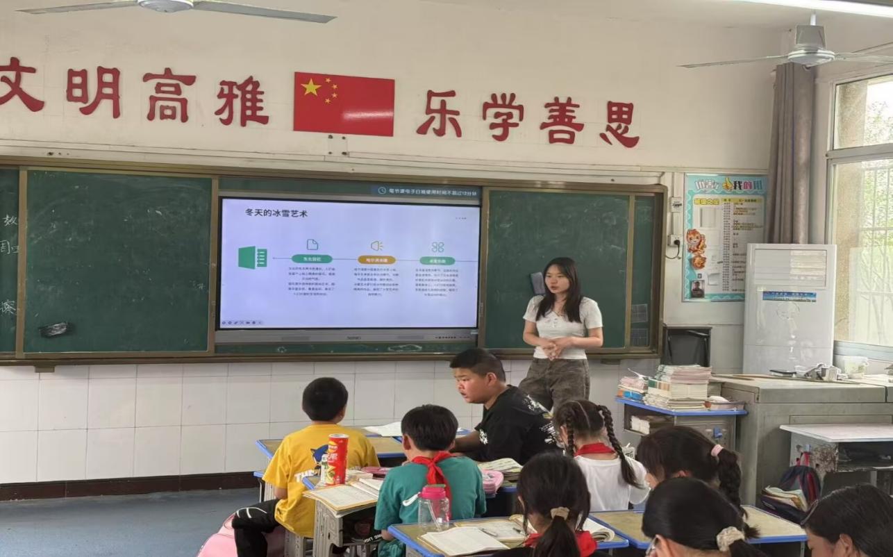 在“神奇地球”小课堂上,志愿者用生动形象的比喻讲解地球构造,把地壳比作“鸡蛋壳”,地幔比作“蛋白”,地核则是"蛋黄",让孩子们轻松理解抽象概念。在讲解中国气候时,志愿者用"庄稼地里的不同菜畦"来打比方——沿海地区就像"水稻田",总是湿漉漉的;西北地区好比"旱地瓜田",干得裂口子;青藏高原则像"冬天的大白菜地",常年盖着雪被子。在讲解中国河流时,志愿者化身"河流爷爷",给孩子们讲起了"水的旅行故事":"从前啊,长江哥哥和黄河弟弟从青藏高原的'冰雪城堡'出发。长江哥哥性子急,一路蹦蹦跳跳穿过峡谷;黄河弟弟走得慢,边走边玩泥沙,结果把自己都染黄啦!"这种寓教于乐的授课方式,让深奥的知识变得触手可及,不仅激发了孩子们的好奇心,更让教室变成了欢乐的乐园。