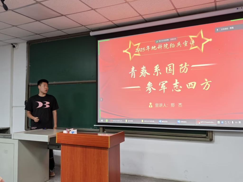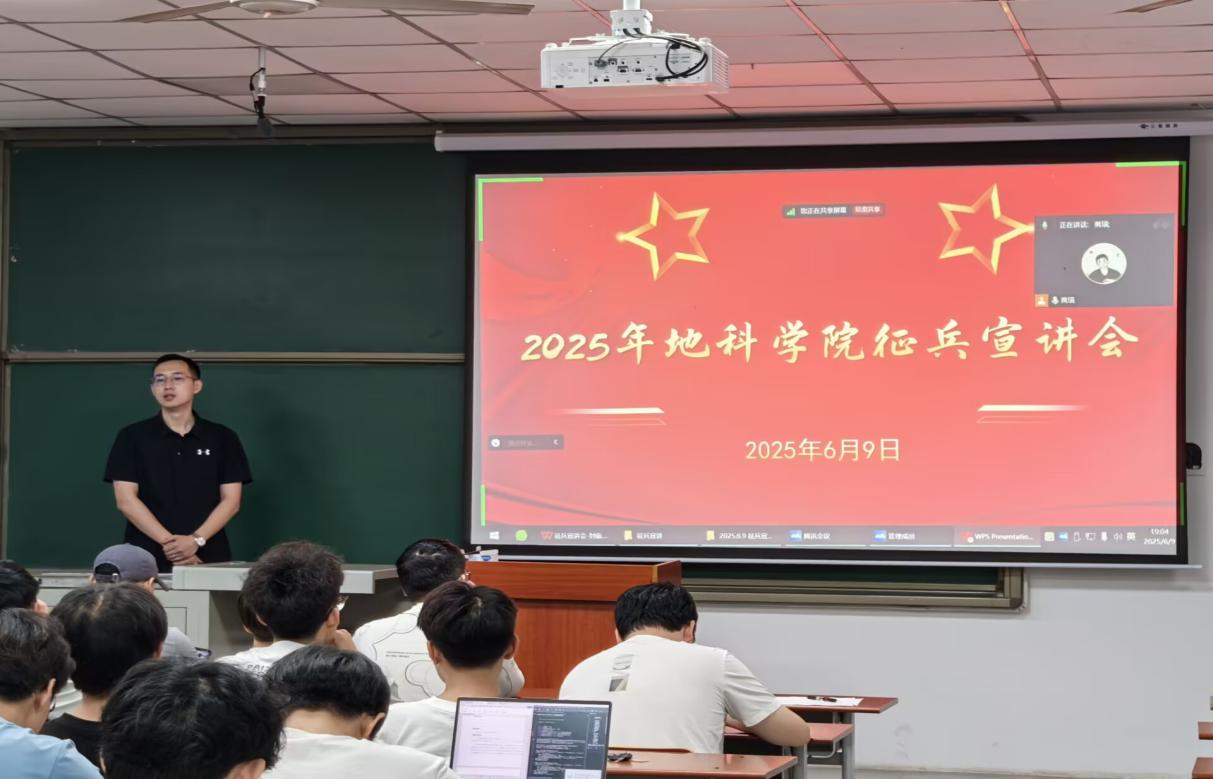 (通讯员 刘佳琪 摄影 李雨泽)为响应国家号召,激发我院学生参军报国热情,6月9日晚7时,2025年地科学院征兵宣讲会在武教B202以线上线下融合方式举行。会议由退伍士兵郑杰、朱正康担任主讲,辅导员黄瑱老师主持,400余名学生参与活动。