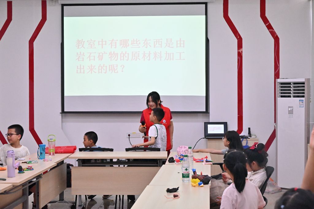 紧接着,王依林从孩子们的生活入手,以生活中常见用品以及教室内物品所含的矿物为切入点,深入浅出地讲解矿物在生活中的不可或缺性。她告诉孩子们,无论是日常使用的手机、电脑,还是建造房屋的砖块、水泥,都离不开矿物的贡献。通过这种贴近生活的讲解方式,孩子们深刻认识到地学知识与自己的生活息息相关。为了奖励孩子们的出色表现,这一环节结束后,志愿者为孩子们发放了漂亮的紫水晶标本作为奖品。孩子们手捧着晶莹剔透的紫水晶,脸上洋溢着自豪和喜悦的笑容。