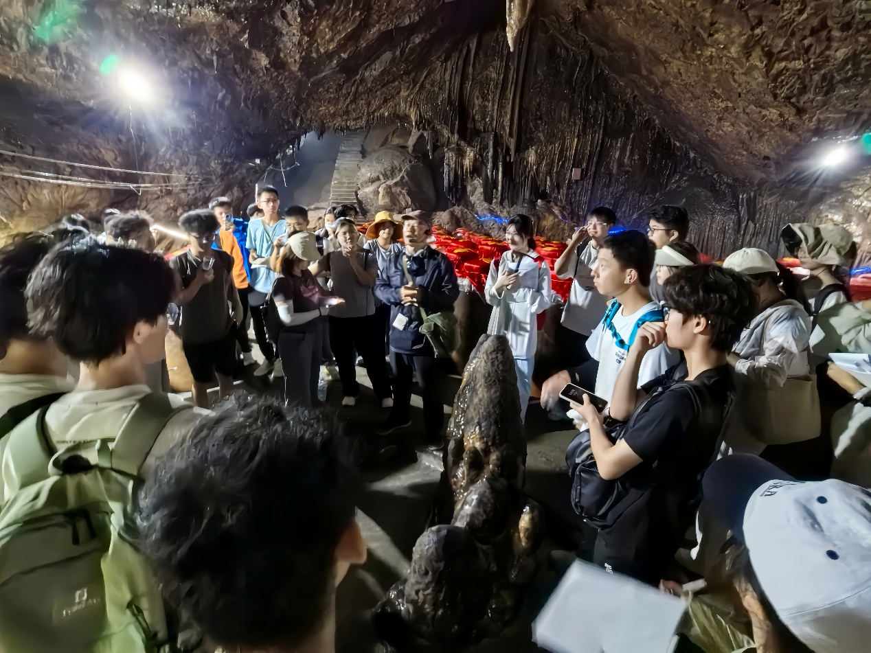在古神洞里,老师们引导同学们观察地下溶洞地貌,大家以往在课本中“纸上谈兵”的知识在形态各异的钟乳石、石笋、石柱等景观前,逐渐变得鲜活立体,有了真切可感的画面。龚文平老师指着从洞顶向下生长的钟乳石介绍:“钟乳石是含有碳酸钙的水,从洞顶滴落时,水分蒸发、二氧化碳逸出,碳酸钙沉淀下来,经过漫长时间逐渐累积而成。”同学们边拍照边记录,地信(产业)22401陈喻莹菲说:“石幔、石钟乳形态各异,真实观察让我对溶洞的形成原理印象更加深刻!”