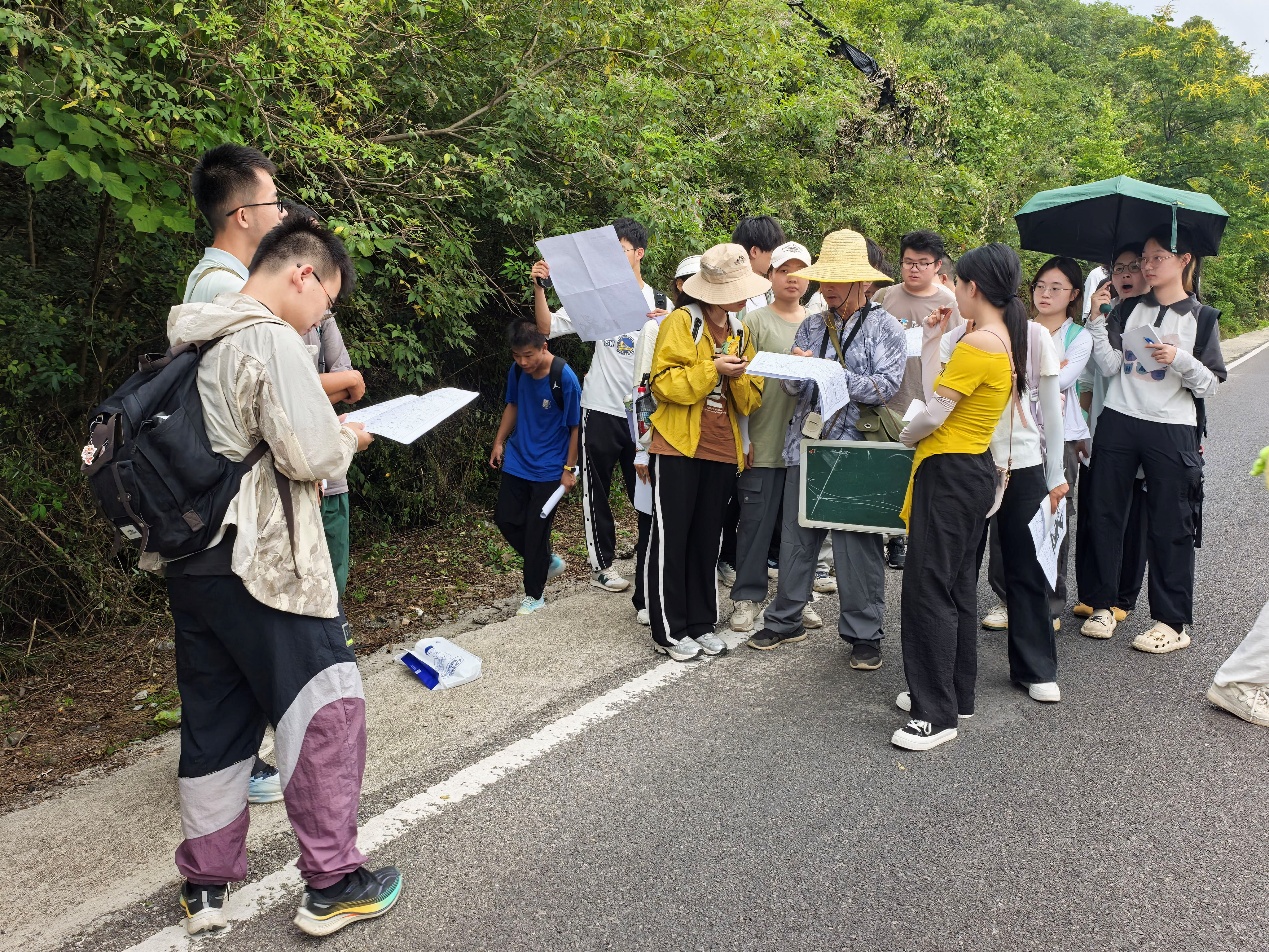 在水岩屋,老师们开展地形图与罗盘实操教学。李功权老师一边讲解一边实操,“在野外观察中,没有参照物时,罗盘就是‘不会出错的方向指南’”。结合实地地貌,同学们掌握了地形图判读、地物符号识别及方位识别。地信(产业)22401唐泽宇说:“通过实地考察,我们三人在分工合作中掌握地形图判读的方法和利用罗盘辨别方位的实用技能,真正将课堂理论和野外实景紧密结合。”