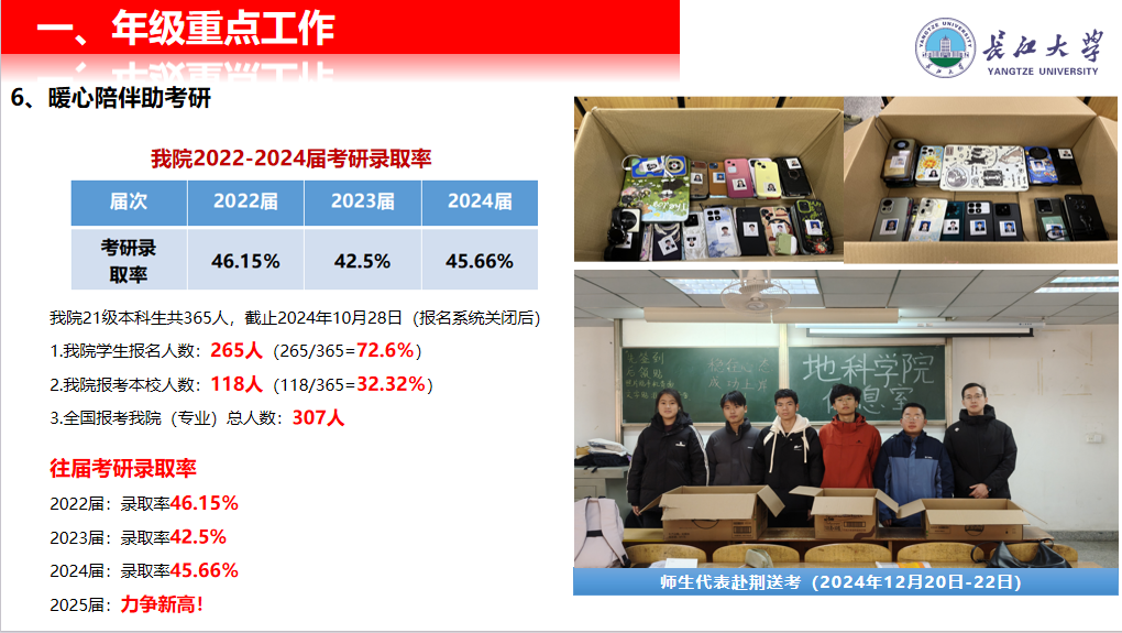 会议系统梳理了本学期多项关键安排,包括学生返校流程、毕业资格审核、毕业设计进度及各专业实习计划,提醒家长共同关注学生学业完成情况。针对考研升学,学院详细介绍了近年考研趋势、院内资源支持及重要时间节点,并展示了师生赴荆送考、考研送温暖等暖心举措,体现全程陪伴的育人理念。