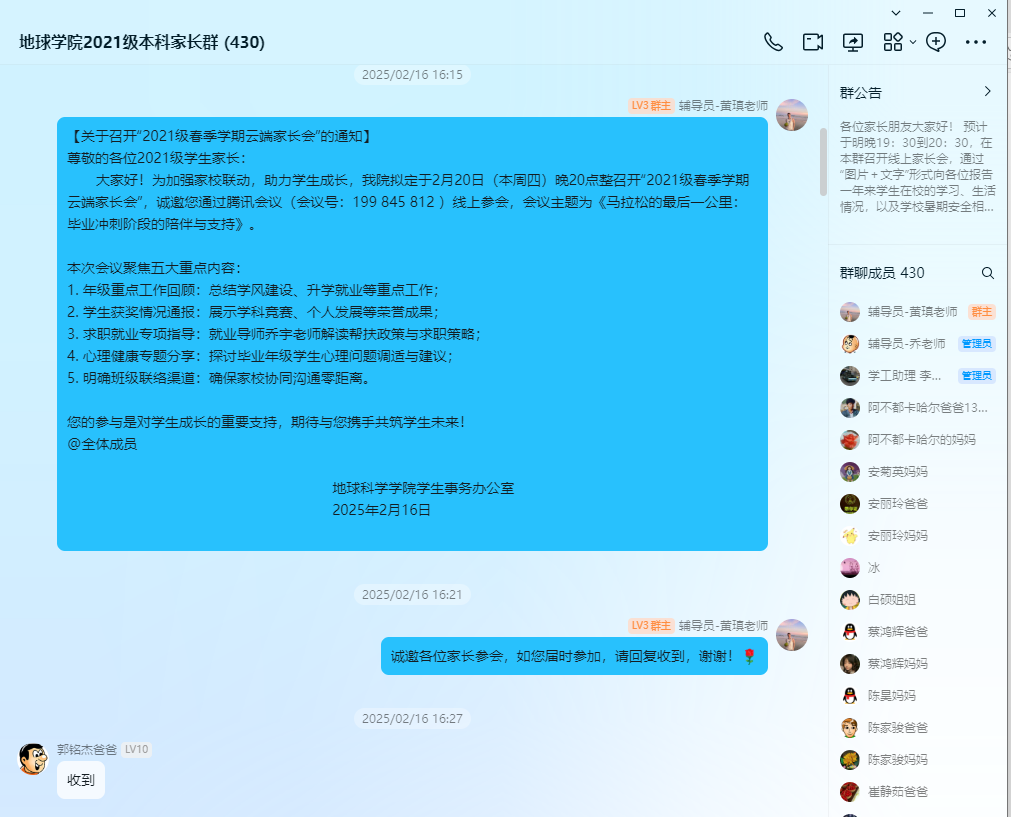 本次家长会构建了家校互信的沟通平台,强化了双方在学生成长成才路上的共同责任。学院将继续推进“五育并举、两线贯穿、全员覆盖”的思政工作体系,与家长携手同行,为21级学生圆满完成大学学业、走向社会奠定坚实基础。