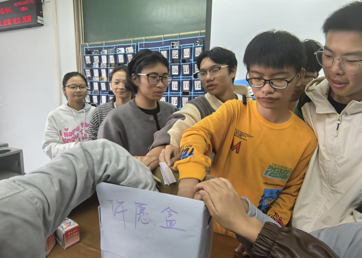 随后,各班级分批开展了“你的愿望我实现”主题活动,同学们将自己的小心愿写入纸条、投入“许愿箱”,并随机抽取成为彼此的“愿望守护者”,在接下来的一学期,努力帮助彼此达成心愿。活动在轻松氛围中促进了同窗情谊,也让温暖与关怀在班级中流动。在“放飞梦想,扬帆起航”环节,同学们认真写下对大学生活的展望与规划,将彩纸折成纸飞机。随着一片欢呼,五彩的纸飞机齐飞向空中,象征着同学们正式启航,一路顺风。