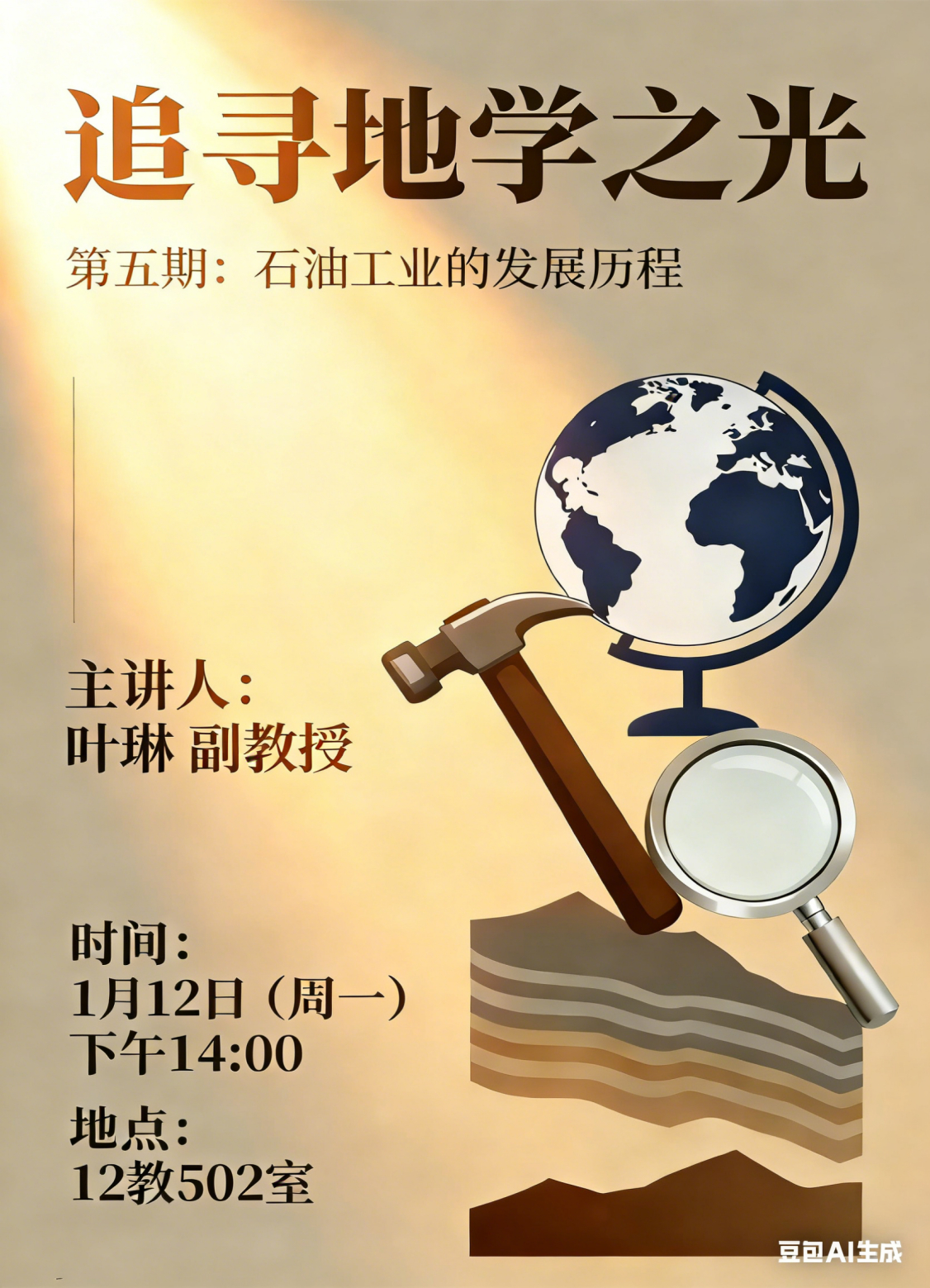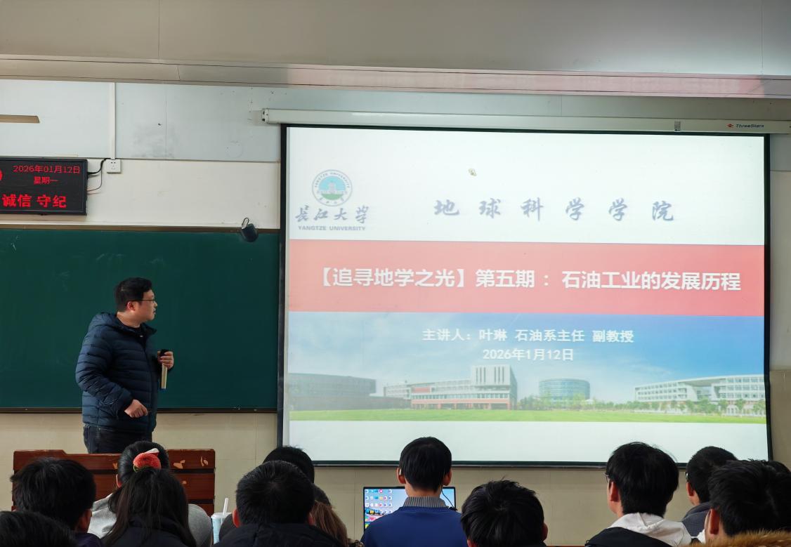 (通讯员 黄瑱 欧登波 徐泽文/摄)1月12日下午,在东校区12教502室,石油系主任叶琳副教授以“石油工业的发展历程”为题,开展了第五期“追寻地学之光”学术活动,全体2025级学生参加,活动由年级辅导员黄瑱主持。
