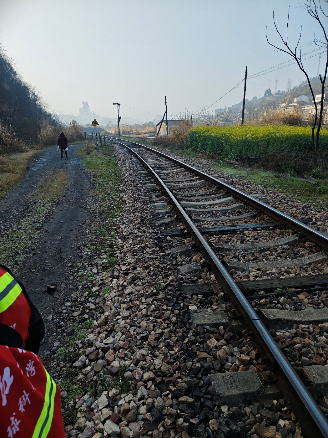 清晨的薄雾还未散尽,我们沿着老铁路线向老电厂附近的断层进发。铁轨在山野间蜿蜒向前,两侧的油菜花泛着明黄,远处的水泥厂烟囱在晨雾中若隐若现,同学们的鞋底和铁轨上的碎石碰撞出清脆声响,像是为这场与断层的相遇提前奏响序曲。