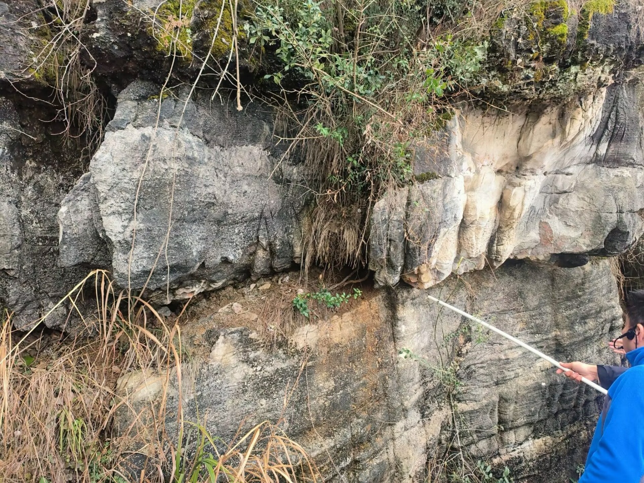 清晨,细雨薄雾笼罩刘家场群山,我们踏着湿滑的山路前往古神洞,鞋底沾满赭红色泥土。沿途老师讲解,此地岩石为上寒武统三游洞群浅灰、灰黑色厚层粉晶白云岩,夹砂屑、砾屑白云岩,岩层厚约300米,形成于距今五亿年前的寒武纪晚期,我将这个漫长的时间刻度认真记在笔记本上。